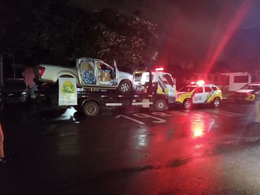 Na primeira ocorrência, policiais avistaram uma caminhonete Frontier estacionada em uma rua da cidade, com vidros escuros e carregada. Ao vistoriarem o veículo, encontraram 30 caixas de cigarros paraguaios. A caminhonete era roubada.