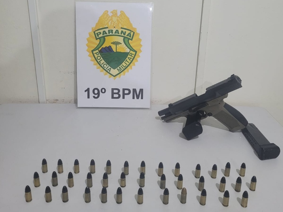 Durante a abordagem, os policiais encontraram uma pistola calibre 9mm com 38 munições dentro do veículo.