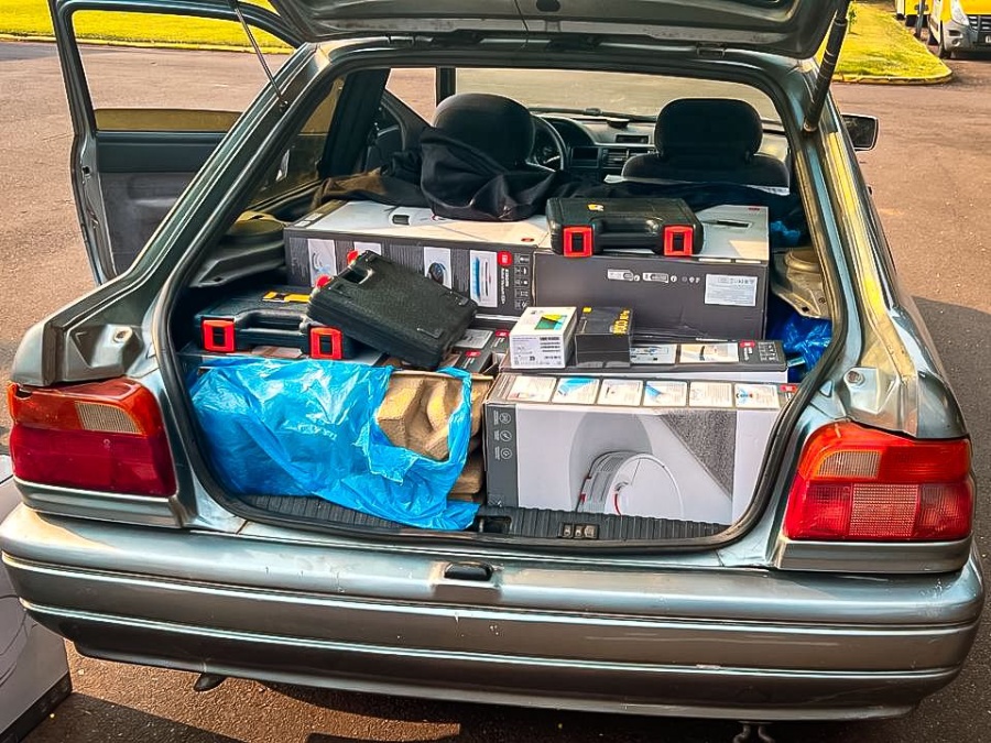 Conforme a PM, após diligências do Setor de Inteligência da PM e da Receita Federal, a equipe policial abordou o veículo, onde estavam dois indivíduos. Em vistori no interior do veículo, diversos aparelhos eletrônicos foram encontrados.