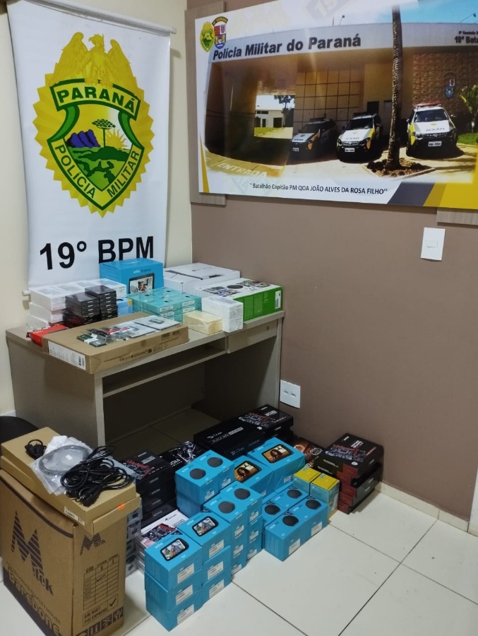 Segundo a PM, o condutor da caminhonete, que estava acompanhado de duas mulheres, não portava nada de ilícito, mas no compartimento de carga foram encontrados eletrônicos, celulares, acessórios para computadores, alexas, vídeo games, entre outros.