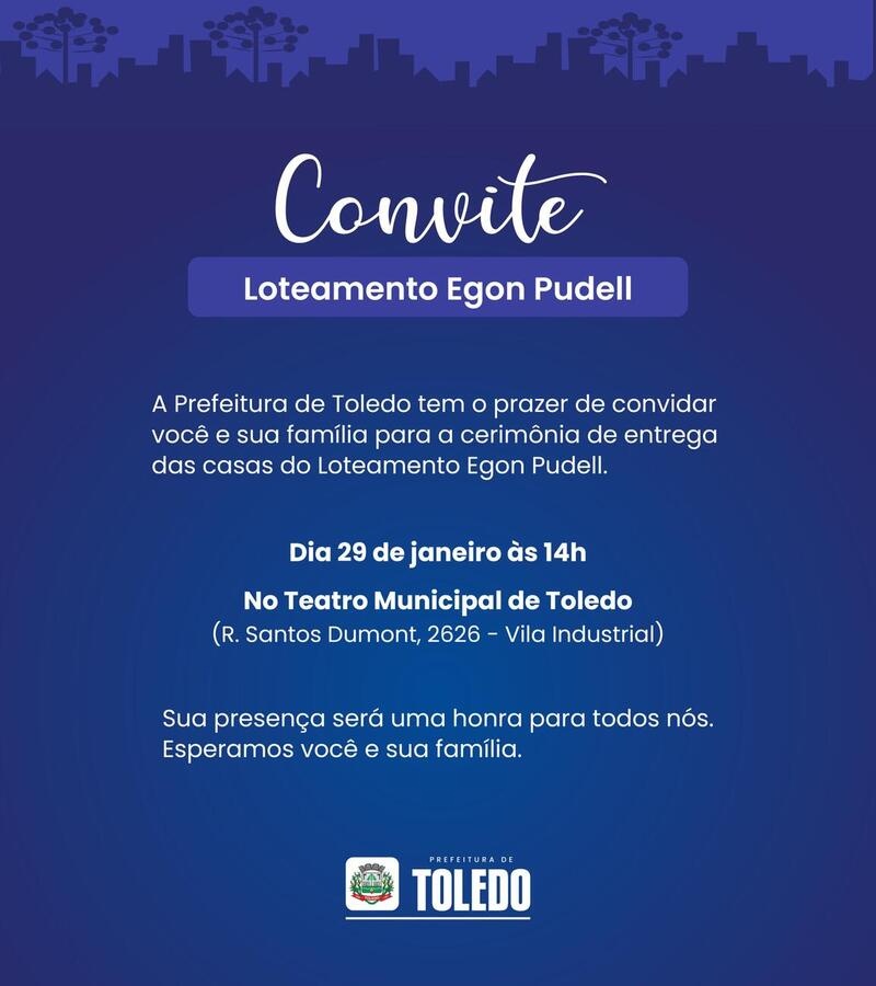 Na quarta-feira (29), a Prefeitura de Toledo, por meio da Secretaria do Planejamento, Habitação e Urbanismo, vai realizar uma cerimônia de entrega de 84 casas da fase 1 do Loteamento Egon Pudell.