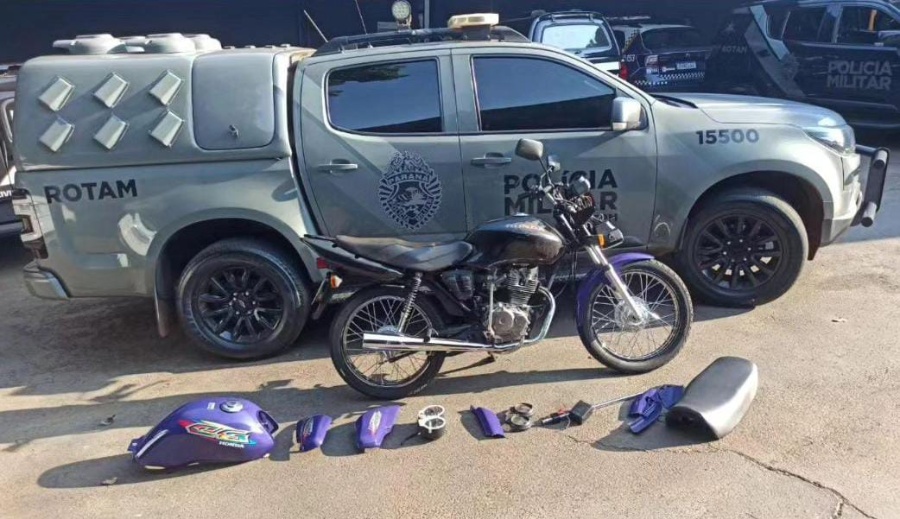 Na residência verdadeira, os policiais encontraram a motocicleta furtada, com a placa adulterada e com as peças sendo trocadas. O homem alegou ter comprado a moto na noite anterior por R$ 800,00, mas não apresentou comprovação.
