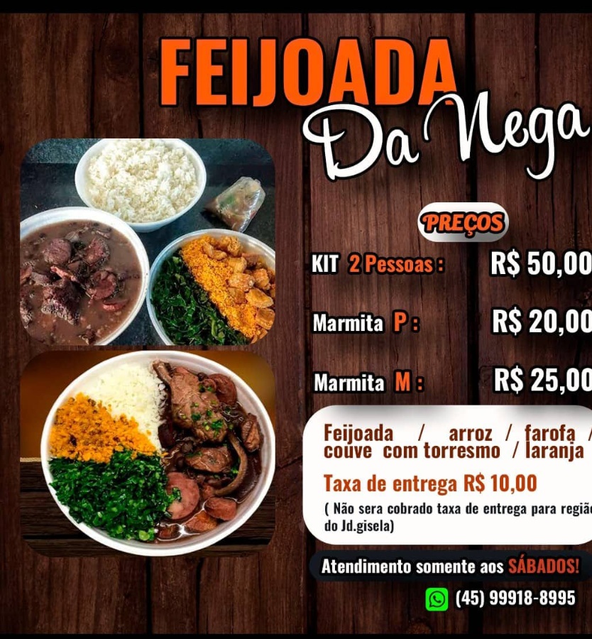 O kit feijoada da Nega vem com uma marmita, feijoada, arroz, farofa, couve e laranja. Tudo isso por apenas R$ 50,00. O kit serve de duas a três pessoas e é ideal para quem quer saborear uma comida caseira e saborosa.