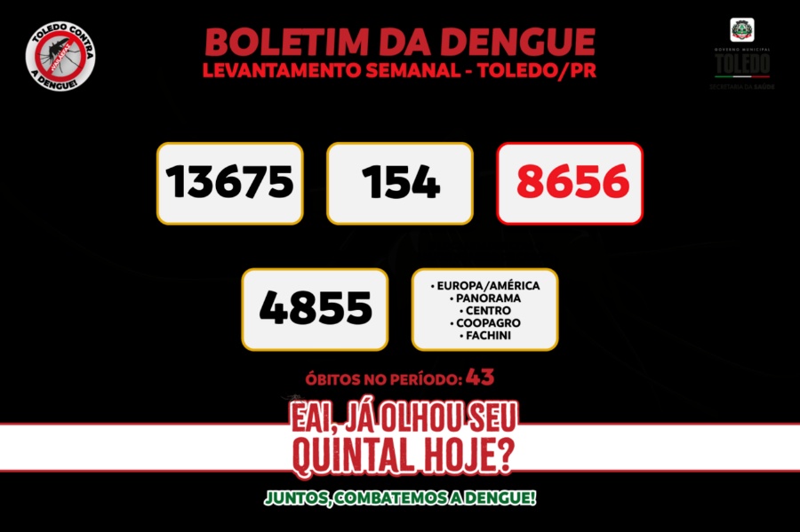 A Secretaria de Saúde de Toledo (SMS) divulgou, nesta sexta-feira (14) os dados referentes à dengue no município. Infelizmente, o boletim epidemiológico trouxe a notícia de mais quatro óbitos causados pela doença e o total no atual ano epidemiológico, iniciado em 1º de agosto de 2023, chegou a 43.