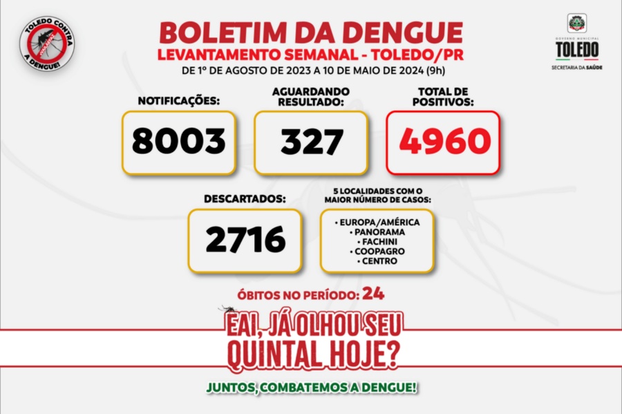 Toledo registrou 4.960 casos de dengue, superando a epidemia de 2019/2020. Com 383 novos casos na última semana, os bairros mais afetados são Europa/América, Panorama, Facchini, Coopagro e Centro. Ainda há 327 casos em espera de confirmação, totalizando 8.003 notificações de sintomas da doença.