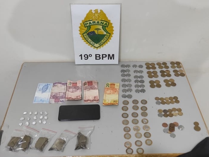 Com base no flagrante, a Polícia Militar entrou em um quarto separado da residência onde o suspeito morava e encontrou mais 12 pedras de crack e 5 porções de maconha em um pote transparente. Também foram apreendidos R$ 94,35 em espécie e um aparelho celular.