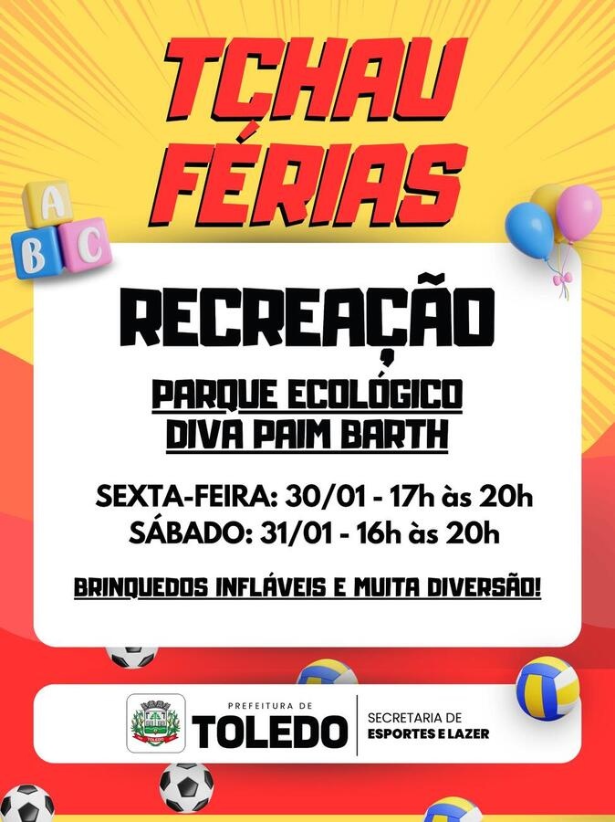 Nesta sexta (30) e sábado (31) o Parque Ecológico Diva Paim Barth receberá a edição especial do RecreAção, o “Tchau Férias”, promovido pela Secretaria de Esportes e Lazer (Smel). Com a programação estendida, o evento oferece mais dois dias de brincadeiras às crianças, com cama elástica e com os novos brinquedos infláveis, adquiridos pela Smel com recursos do Fundo Estadual do Esporte.