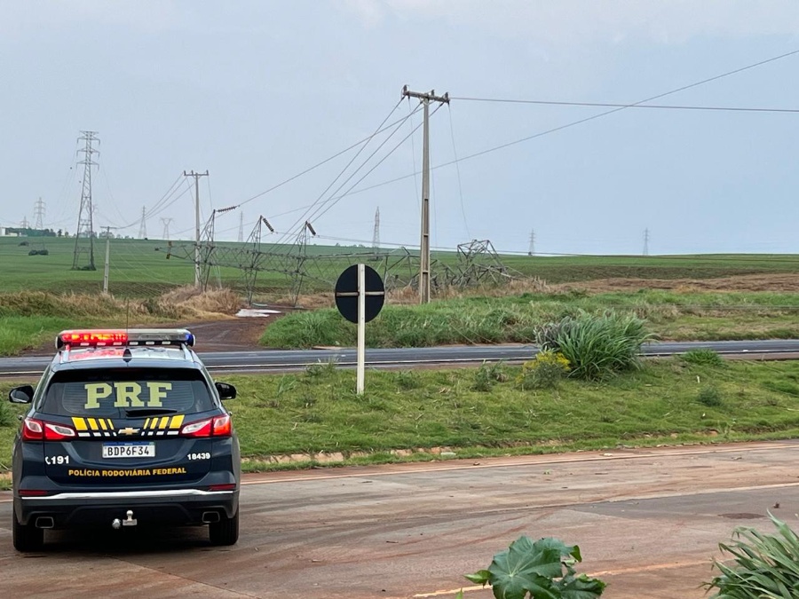 A situação mais grave foi registrada na BR-163, contorno Oeste da cidade. Os fortes ventos derrubaram postes e uma torre de alta tensão, bloqueando completamente a via.