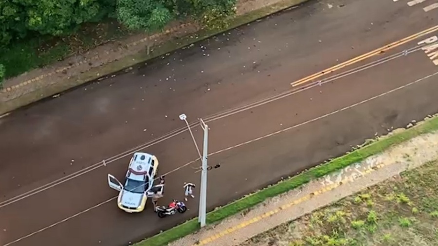 Dois jovens, um de 17 e outro de 18 anos, foram detidos pela Polícia Militar de Toledo na manhã de Natal, após uma fuga de moto que durou cerca de 20 minutos e percorreu vários bairros da cidade. A moto em que eles estavam tinha a placa adulterada com fita adesiva.