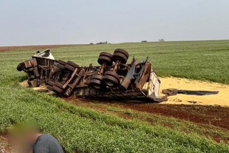 Carreta bitrem tomba na PR-182 entre Maripá e Toledo