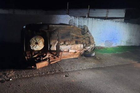 Carro de Toledo fica destruído em capotamento na PRc-467 em Cascavel