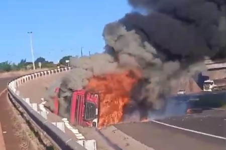 Carreta tomba e pega fogo na BR-163 entre Toledo e Marechal Rondon