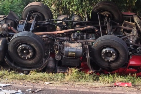 Caminhão capota na PR-317 entre Toledo e Ouro Verde e motorista fica preso às ferragens
