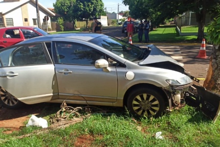 Carro atinge árvore após colisão em Toledo
