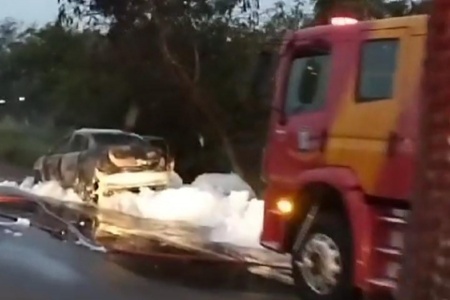 Carro fica destruído em incêndio na BR-467 em Toledo