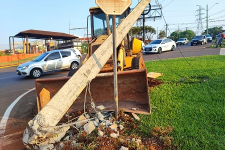 Sem freio, retroescavedeira desgovernada atinge carro e postes em Toledo