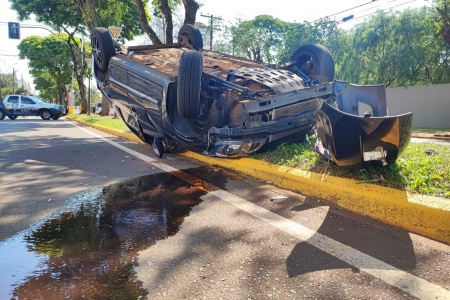 Carro capota após acidente na Avenida Maripá
