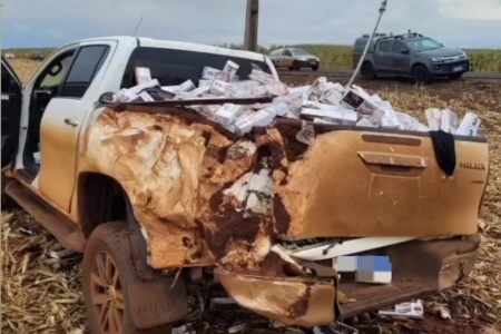 Hilux carregada com cigarros capota na PR-585 entre Toledo e São Pedro do Iguaçu