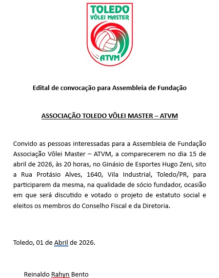 Interessados em integrar a Associação Toledo Vôlei Master (ATVM) poderão participar da assembleia de fundação da entidade, agendada para o dia 15 de abril de 2026, às 20h, em Toledo.