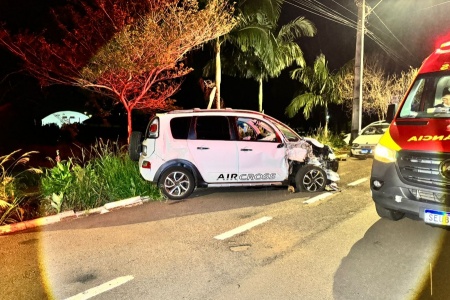 Durante o deslocamento pela avenida, o motorista perdeu o controle da direção, cruzou o canteiro central e atingiu diretamente um poste de iluminação, que acabou derrubado com o impacto.