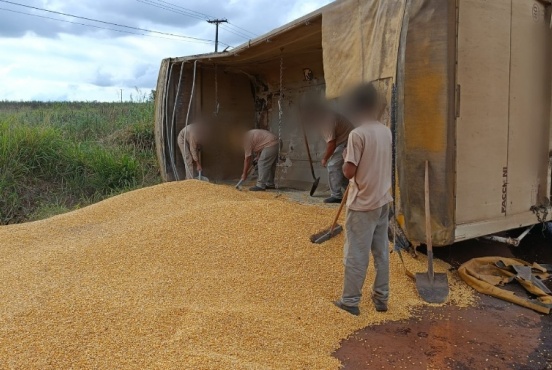 Reboque de carreta tomba e espalha carga de milho em Toledo