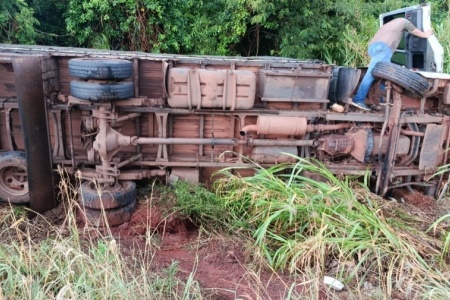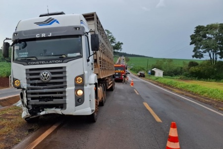 Caminhão de Toledo se envolve em acidente grave na PR-495, em Santa Helena; motorista da Bandeirantes é socorrido