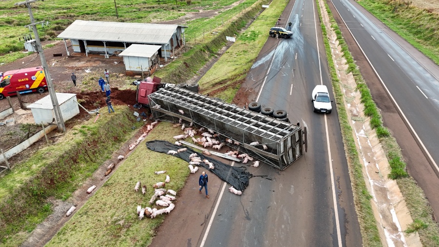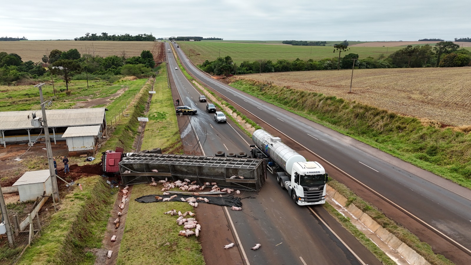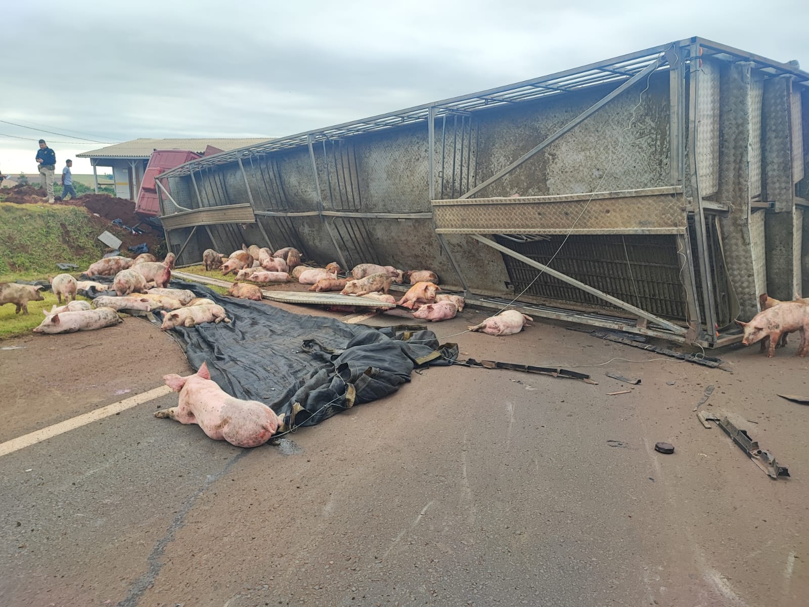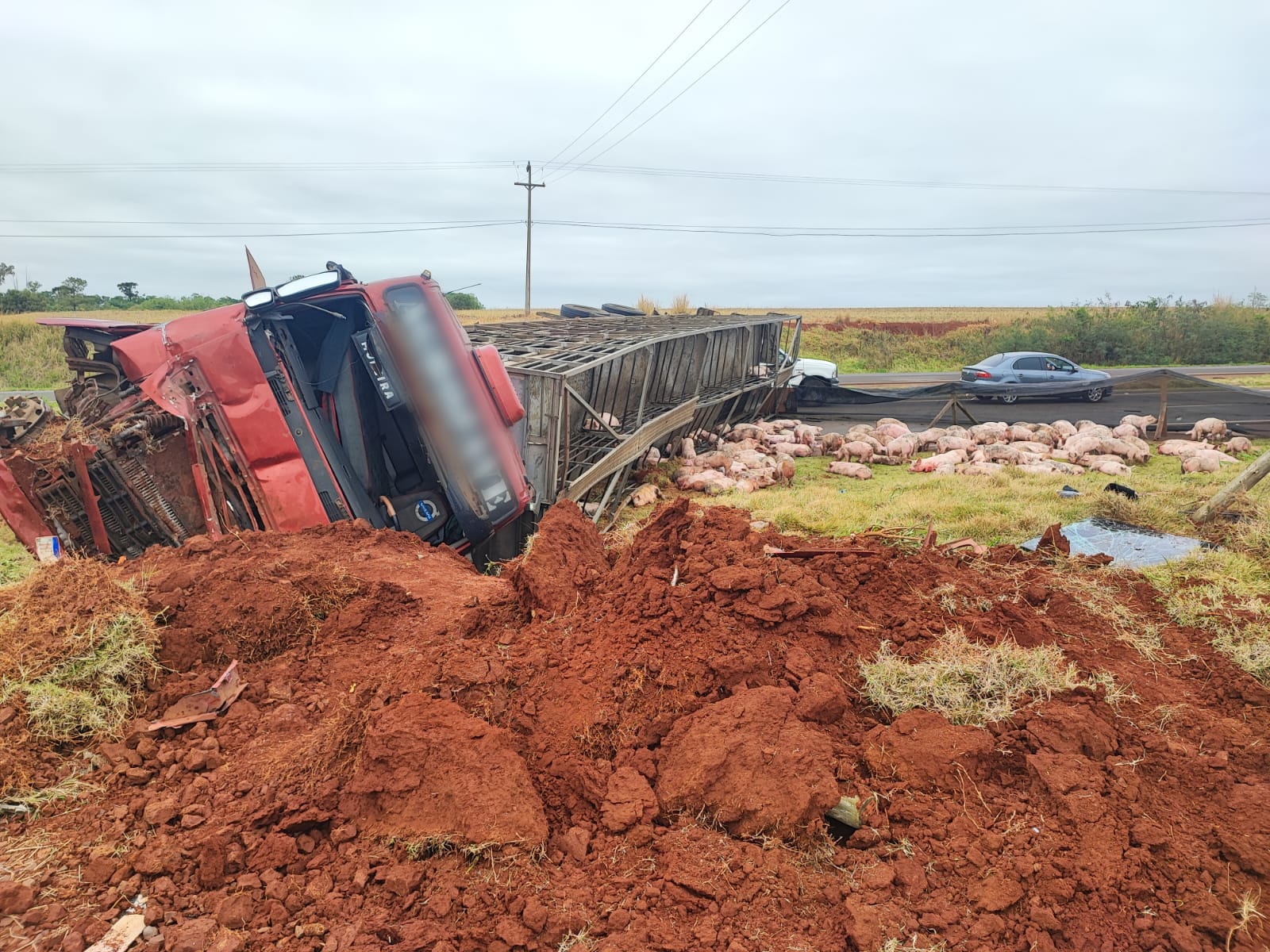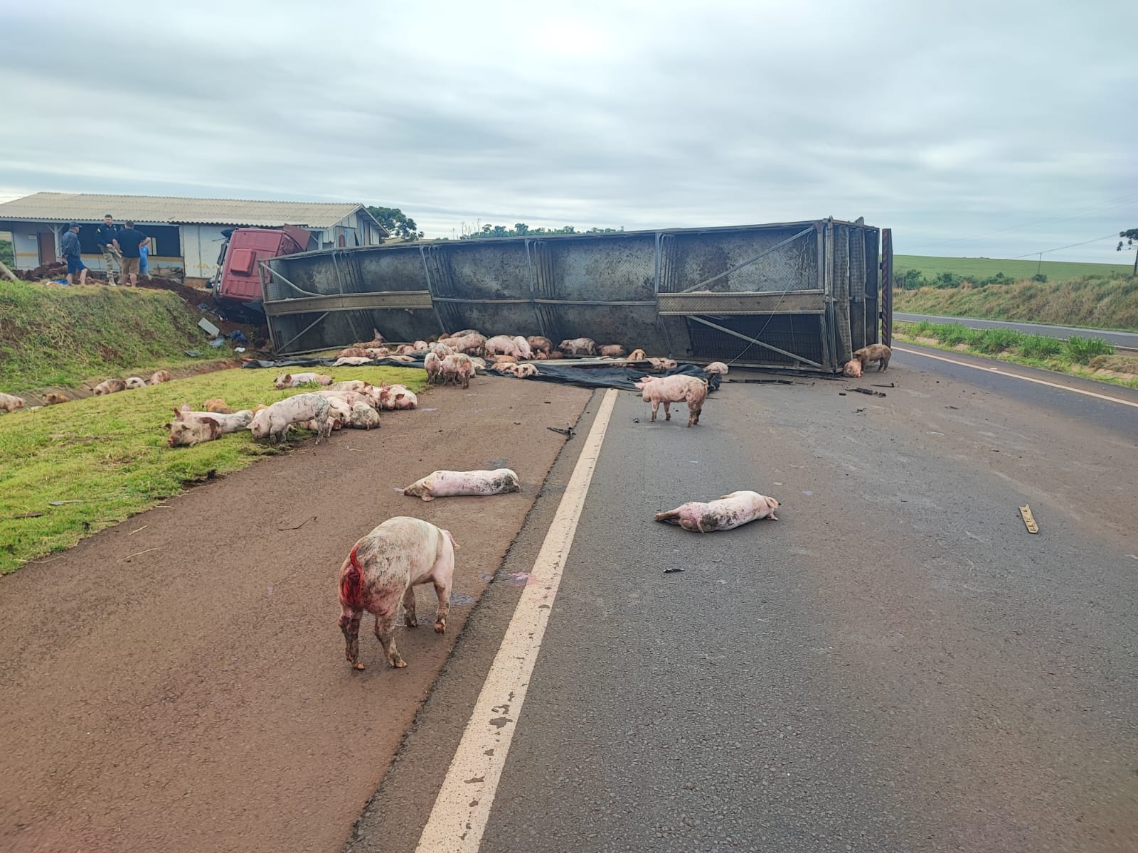 Um acidente envolvendo uma carreta carregada com porcos foi registrado na manhã deste sábado, 14, na BR-163, entre Toledo e Marechal Rondon, próximo à Vila Ipiranga.