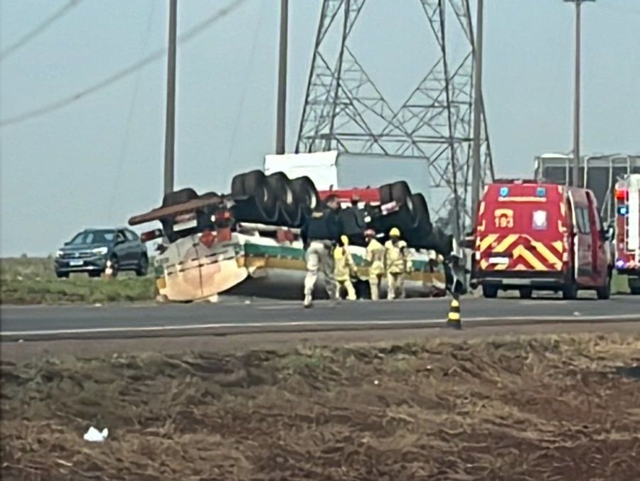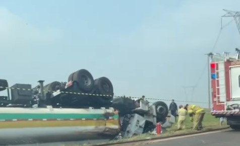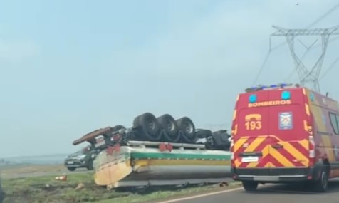 Carreta de combustível capota e motorista fica preso às ferragens, entre Toledo e Cascavel