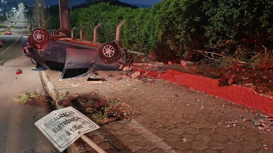 Na sequência, o veículo atingiu uma placa de sinalização, rompeu a cerca de uma propriedade privada e capotou, parando com as rodas para cima, a poucos metros de um poste da rede elétrica.