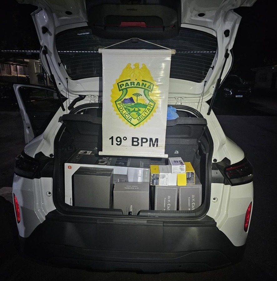 No veículo estavam um homem e uma mulher. Durante consulta ao sistema, foi constatado mandado de prisão em desfavor do condutor. No interior do automóvel foram encontrados diversos produtos de origem estrangeira.