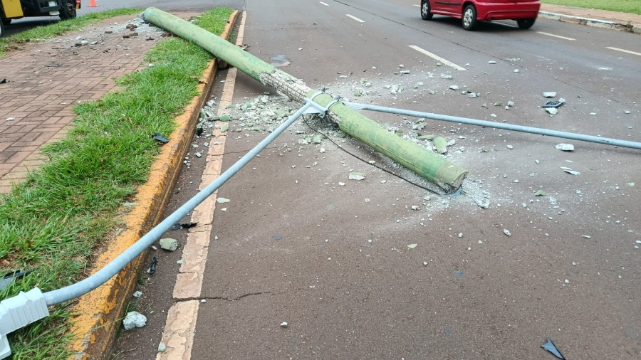 Durante o deslocamento pela avenida, o motorista perdeu o controle da direção, cruzou o canteiro central e atingiu diretamente um poste de iluminação, que acabou derrubado com o impacto.